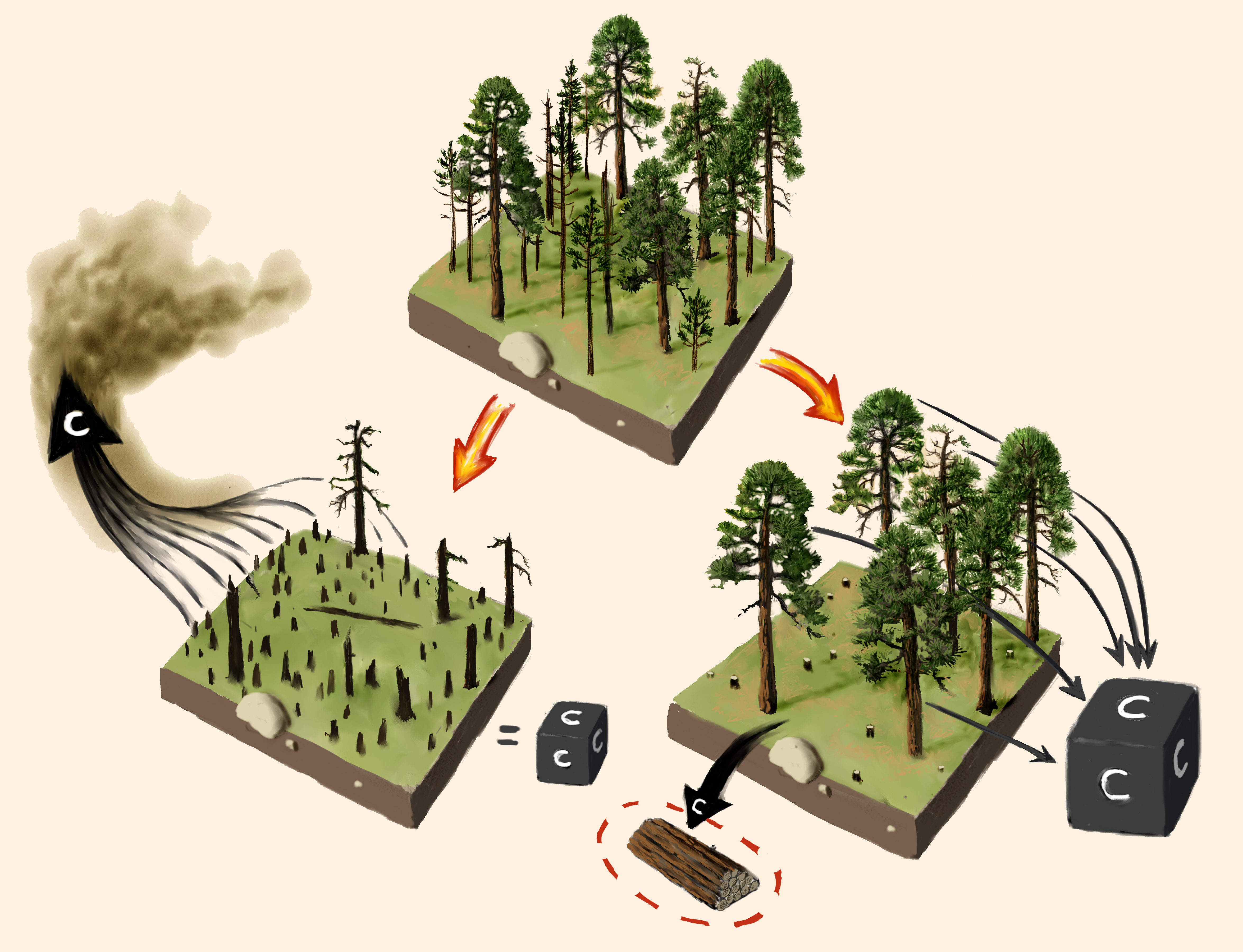 Management of forests for carbon uptake is an important tool in the effort to slow the increase in atmospheric CO2 and global warming. However, some current policies governing forest carbon credits actually promote avoidable CO2 release and punish actions that would increase long-term carbon storage. In fire-prone forests, management that reduces the risk of catastrophic carbon release resulting from stand-replacing wild-fire is considered to be a CO2 source, according to current accounting practices, even though such management may actually increase long-term carbon storage. Examining four of the largest wildfires in the US in 2002, Ecoss-associated research found that, for forest land that experienced catastrophic stand-replacing fire, prior thinning would have reduced CO2 release from live tree biomass by as much as 98%. Altering carbon accounting practices for forests that have historically experienced frequent, low-severity fire could provide an incentive for forest managers to reduce the risk of catastrophic fire and associated large carbon release events.
