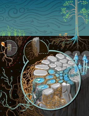 Ectomycorrhizal fungi (the mushrooms connected to the roots of the tree) increase the uptake of nitrogen by the plant, even when that nutrient is scarce in soils. Artwork by Victor O. Leshyk.