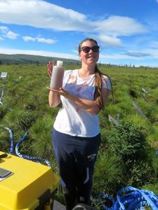 Emily collected water samples from small streams in her study area for the first time this summer. She filtered the water to remove particulate organic carbon and acidified it to preserve and remove dissolved inorganic carbon. Emily brought all the samples to her lab at Ecoss where she will run them through a Total Organic Carbon analyzer to determine the dissolved organic carbon concentration present in each sample. Later this fall, these same samples will be sent to University of California at Irvine and run through a mass spectrometer to determine the age of the carbon in the samples. The oldest carbon can be inferred to have originated from permafrost and is used as a tracer of the movement of permafrost carbon through ecosystems. This research will improve understanding of how tundra ecosystems will both affect and respond to climate change.